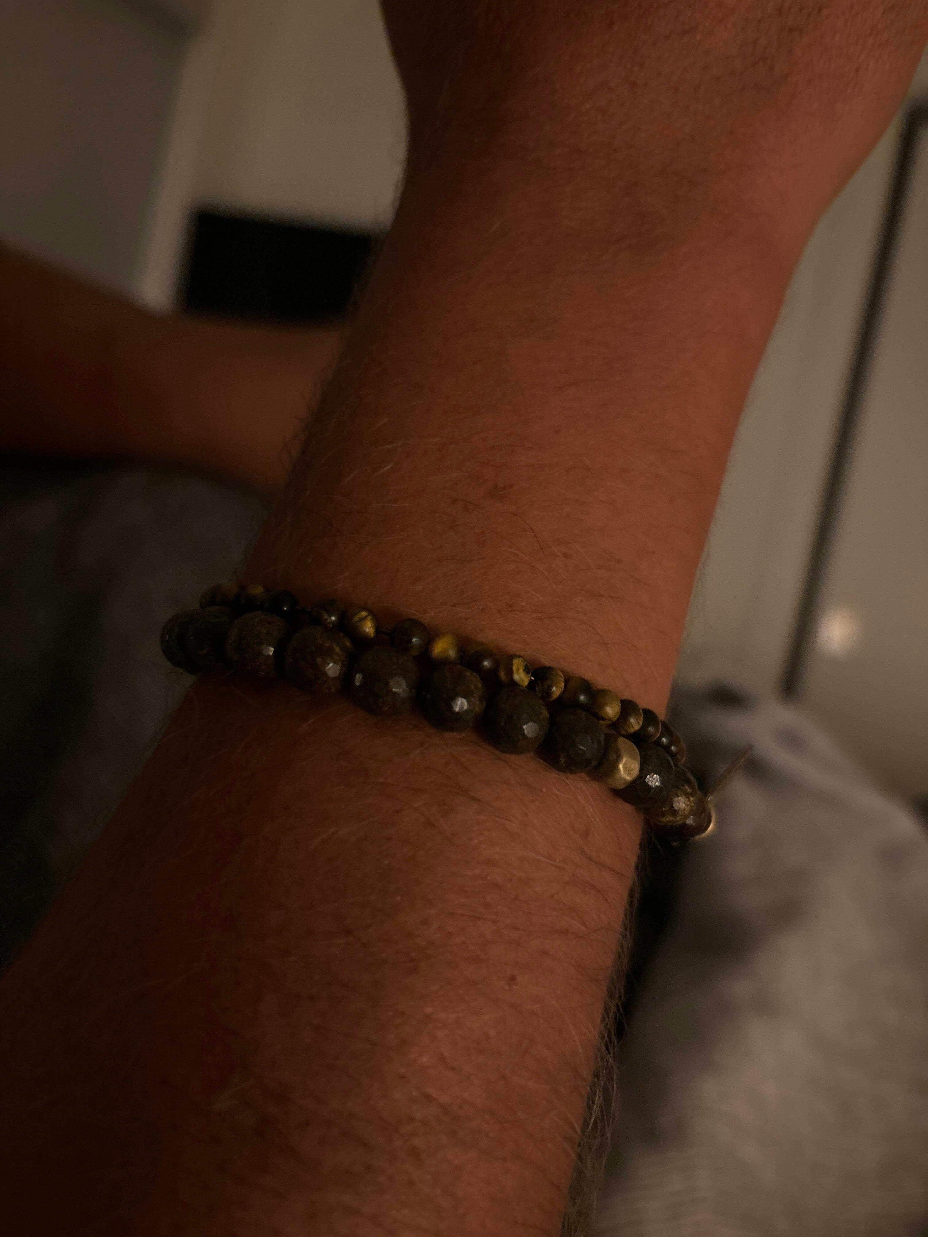 Hi John! Simple and clean, just like John himself. Hand-strung on strong, 1mm stretch cord and made with 8mm faceted bronzite and an accent african brass bead. John is great on his own or paired with a friend.
